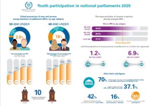 Harta ilustrează principalele concluzii privind reprezentarea tinerilor în parlamentele naționale și cuprinde informații furnizate de 210 camere parlamentare din 155 de țări, la data de 31 iulie 2025. Sunt prezentare, de asemenea, exemple de bune practici pentru creșterea participării tinerilor în parlamentele naționale.